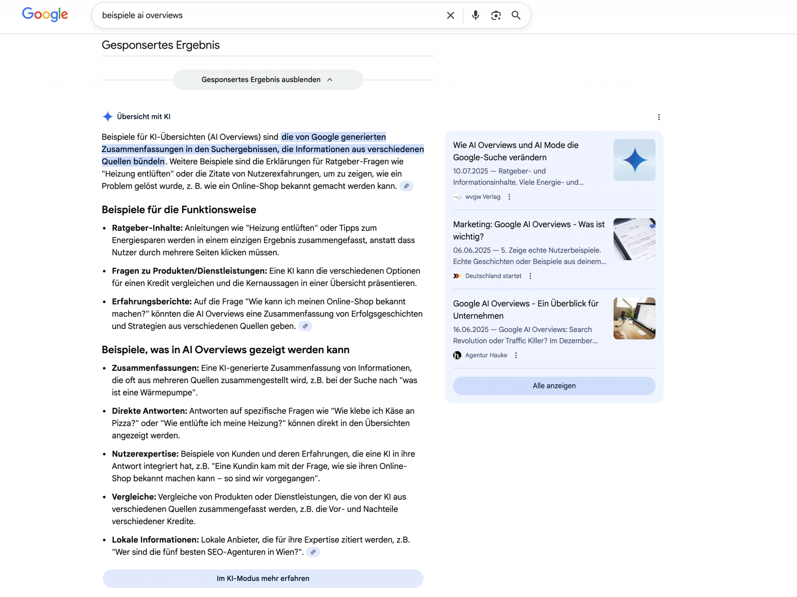 Merke: Gut strukturierte, leicht verständliche Inhalte = Futter für KI-Overviews. Wenn deine Seite wirr oder unklar aufgebaut ist, hat es die KI schwer und greift womöglich auf eine andere Quelle zurück. Dagegen erhöhen sauber gegliederte Abschnitte, direkt beantwortete Fragen und Schema-angereicherter Content die Chancen, in KI-Antworten prominent vorzukommen.