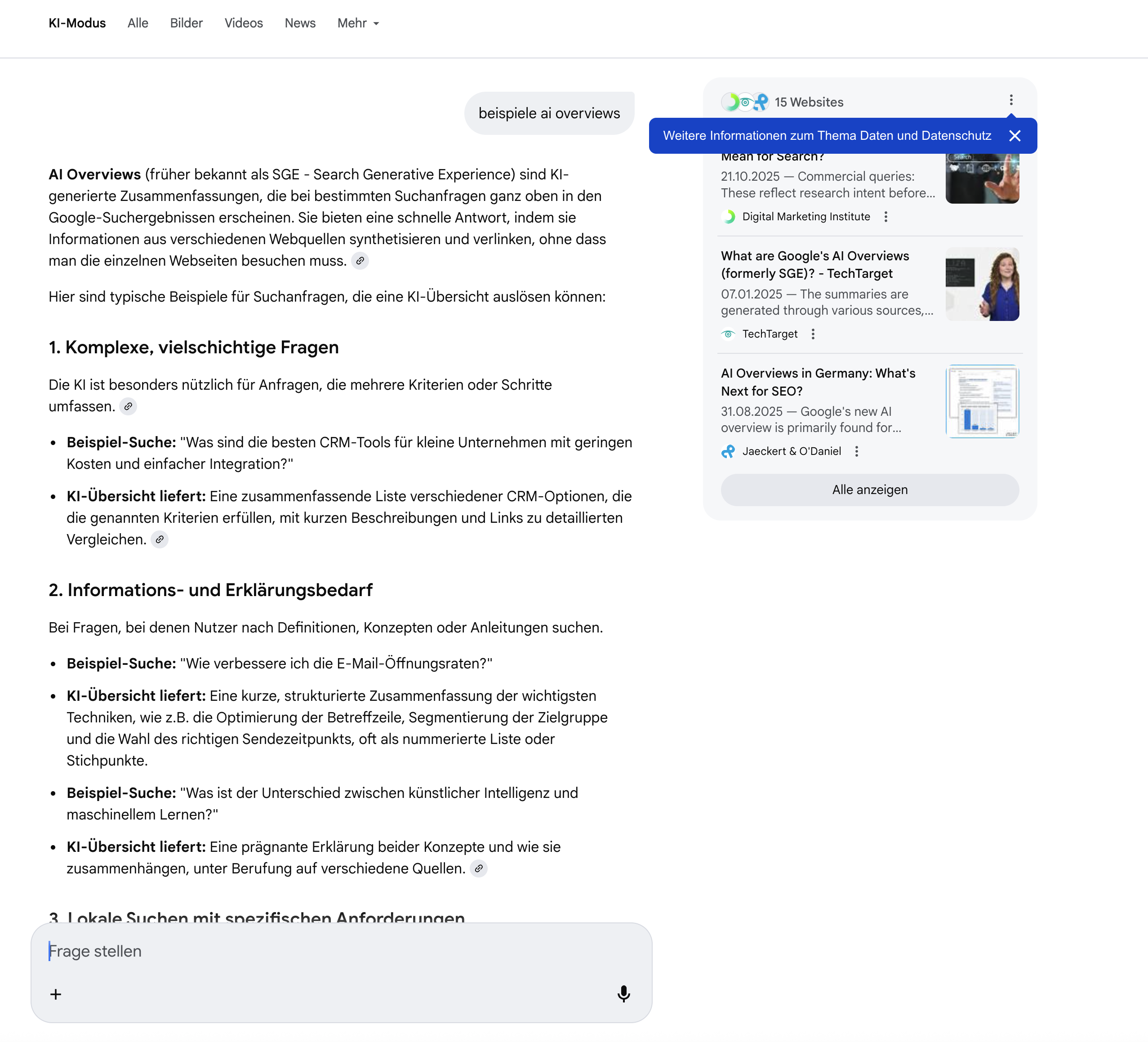 AI Overviews (KI-Überblicke) – Damit sind die KI-generierten Zusammenfassungen gemeint, die Google direkt in den Suchergebnissen anzeigt. Sie erscheinen oberhalb der organischen Ergebnisse und liefern eine Instant-Antwort auf die Suchanfrage. Anders als klassische Featured Snippets, die meist aus einer einzigen Quelle zitieren, ziehen AI Overviews Informationen aus mehreren Webseiten zusammen und verweben sie zu einer Antwort in Fließtext. Google blendet dabei i.d.R. Quellenhinweise ein (z.B. kleine Zitate mit Verlinkungen), sodass der Nutzer die Herkunft der Aussagen nachvollziehen kann. Das Ziel der Overviews ist, dem User schnell eine umfassende Antwort ohne Klick zu bieten. Dieses Feature ist z.B. in Deutschland seit März 2025 live.